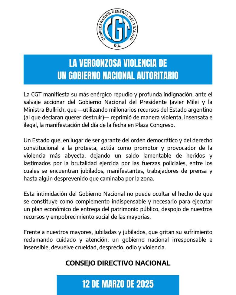 La cúpula de la CGT ya había tomado nota de la importante convocatoria a la marcha en defensa de la diversidad sexual a la que llamaron los colectivos LGTB en enero después del discurso presidencial en Davos, desde donde Milei acusó a los homosexuales de pedófilos. Durante esos días y hasta el sábado pasado, cuando se celebró el Día de la Mujer, la agenda de género sirvió de excusa perfecta de la CGT para mostrarse activa. Ayer, en tanto, tras los incidentes en el Congreso, la CGT dio alguna pista de la definición que se viene. “Frente a nuestros mayores jubilados, que gritan su sufrimiento reclamando cuidado y atención, un gobierno nacional irresponsable e insensible, devuelve crueldad, desprecio, odio y violencia. Ante lo que está sucediendo, la CGT evaluará en la próxima reunión de consejo directivo medidas de acción en repudio de la represión”.