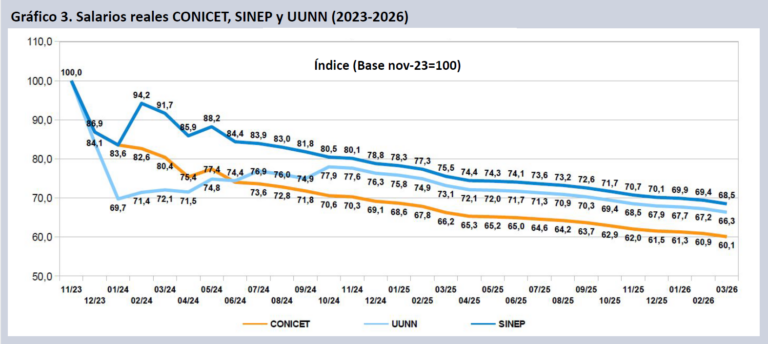Esto abarca las remuneraciones de los trabajadores de todo el Sistema Nacional de Ciencia y Tecnología, que tuvieron incrementos nominales del 2,0% en el mes, contra una cada vez más acelerada variación del índice de Precios al Consumidor del INDEC, la cual alcanzó el 3,4% en marzo de 2026. De esta manera los salarios perdieron un 9,3% en los últimos 12 meses y caen entre un 31,5% y un 39,9% desde noviembre de 2023, explicaron desde el Grupo EPC-CIICTI.