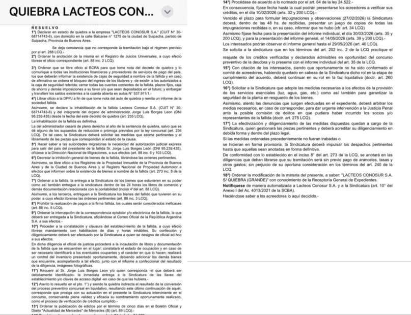 La Justicia en lo Comercial de Mercedes decretó la quiebra de la empresa Conosur SA, controlante de la tradicional láctea La Suipachense, luego de tres meses de parálisis total en su producción. El fallo fue emitido por el juez Leandro Julio Enríquez, tras el pedido de Julián Coronel, abogado histórico del gremio ATILRA y apoderado de Watt’s SA, una de las principales firmas acreedoras.
