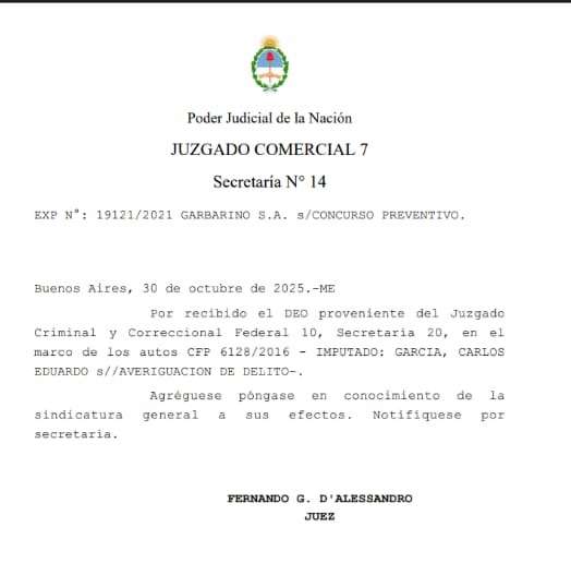A comienzos de octubre, se conoció que los síndicos de la causa que lleva la quiebra de la empresa pidieron investigar al menos “tres operaciones sospechosas”, que habían sido advertidas en su momento por la AFIP. Se trata de movimientos realizados bajo la gestión del ex CEO Carlos García, y que involucrarían a los hermanos Daniel y Omar Garbarino. Así lo marcan fuentes judiciales consultadas por Data Gremial, que confirmaron la presentación judicial. La denuncia judicial fue presentada por los propios síndicos ante D’Alessandro. Se trata de tres reportes de operaciones que se incluyeron en la causa 6.128/2016 del registro de la Secretaria 20 del Tribunal Federal 10, que están pidiendo al juez de la quiebra que vuelva a investigar. En octubre, se contestó este pedido.