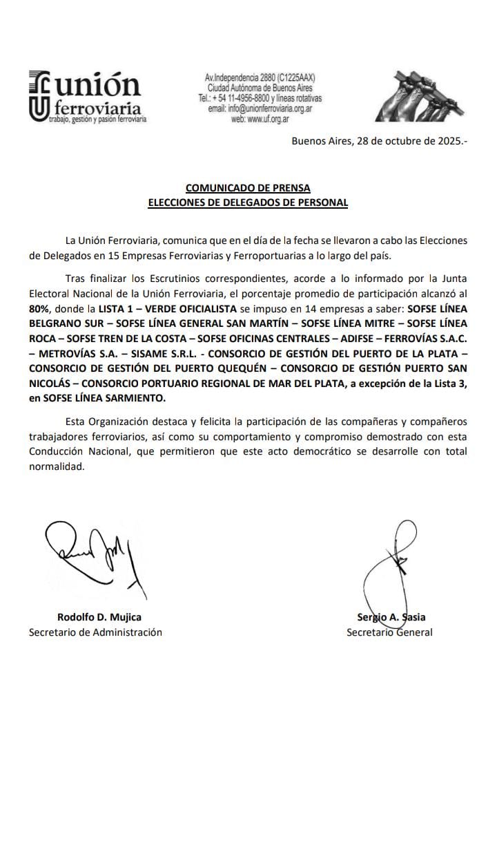 En la jornada de hoy se realizaron las Elecciones de Delegados de la Unión Ferroviaria en las 15 Empresas Ferroviarias y Ferroportuarias de todo el territorio nacional, donde la Lista 1 Verde que se encolumnan bajo la conducción nacional de Sergio Sasia (Oficialista) logró un abrumador triunfo en 14 de las 15 empresas donde se elegían representantes gremiales.