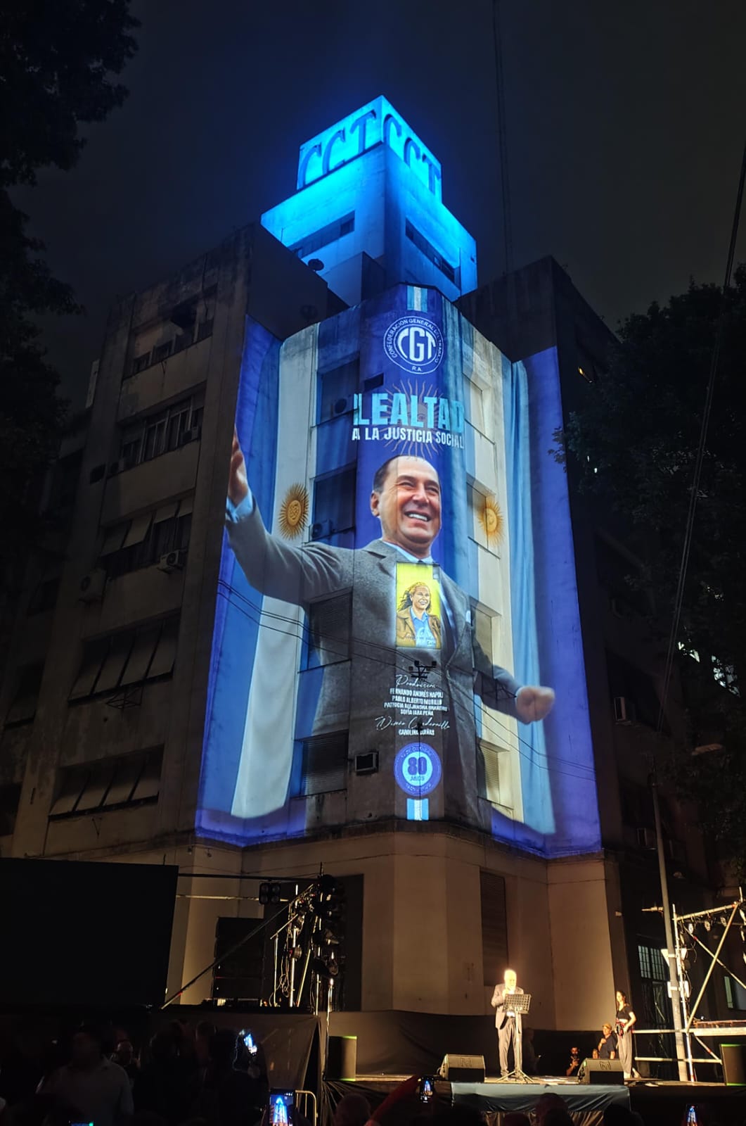 La CGT realizó un acto de conmemoración del Día de la Lealtad Peronista, que se diferenció de ceremonias de años anteriores. Incluyó performances teatrales, un show de música trap y una proyección de mapping sobre la fachada de su histórica sede de la calle Azopardo. Todo eso bajo la temática del 17 de Octubre de 1945 que marcó el nacimiento del movimiento político creado por Juan Domingo Perón.