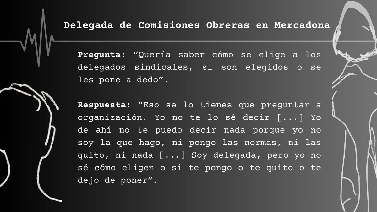 “¿Cómo te eligieron entonces?“, pregunta Andrea. ”Vamos a ver“, responde ella. “Eso es... acuerdos entre la empresa y trabajadores”, y añade: “Yo de ahí no te puedo decir nada porque yo ni pongo las normas ni las quito. Soy delegada pero no se cómo eligen si te pongo o te dejo de poner”. Pasados unos segundos, esa mujer acaba diciéndole a Andrea que, como ya no trabaja en Mercadona, no le puede decir nada sobre el tema. “A mí no me vas a hacer un interrogatorio, eh”. Y solo es al final de la conversación, después de varias veces insistiendo en la misma pregunta, que la delegada afirma haber sido elegida “por votación, claro”.