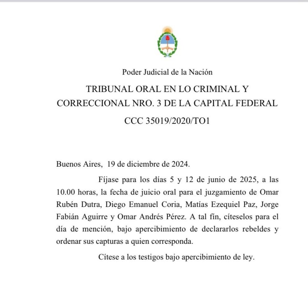 La resolución judicial que fijó la fecha del juicio contra Omar Pérez y otros dirigentes de Camioneros por un bloqueo