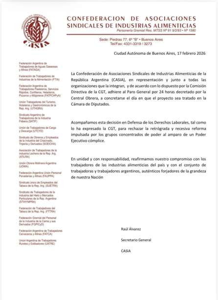El paro general impulsado por la Confederación General del Trabajo (CGT), estipulado para este jueves, suma cada vez más adhesiones y la Confederación de Asociaciones Sindicales de Industrias Alimenticias (CASIA) no es la excepción, ya que sus federaciones confirmaron que acatarán la medida en contra de la reforma laboral.