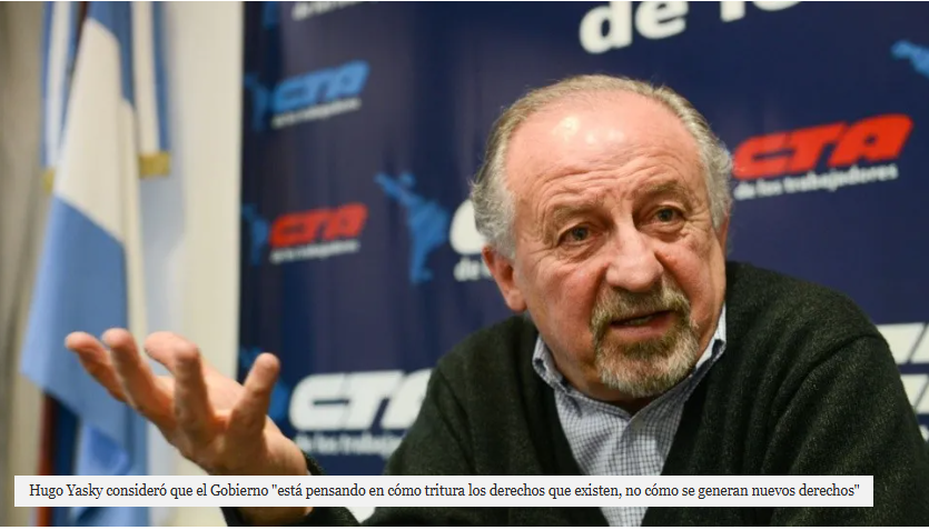 Yasky finalmente lamentó que el gobierno "está pensando en cómo tritura los derechos que existen, no cómo se generan nuevos derechos" y afirmó que es urgente legislar sobre temas modernos ignorados como "el tema del trabajador de plataforma" y la actualización de la ley de "teletrabajo", además de la "inserción laboral de los jóvenes".