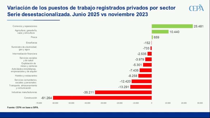 En tanto, desde el CEPA dedicaron parte de sus últimos reportes al tema laboral, uno de los cuales mostró la cantidad de despidos. Según un relevamiento, entre noviembre de 2023 y junio de 2025 “cerraron 16.322 empleadores y se destruyeron 236.139 puestos de trabajo registrados en unidades productivas, lo que equivale a una caída del 2,4 por ciento del empleo formal”. En términos absolutos, el sector más golpeado fue “Servicios de transporte y almacenamiento”, que perdió 4159 empleadores, lo que representa una caída relativa del 10,5 por ciento. En materia de empleo, el rubro “Administración pública, defensa y seguridad social obligatoria” encabezó la pérdida de trabajadores, con 89.794 empleos menos. En términos relativos, la construcción fue la actividad más castigada, con una disminución del 17,1 por ciento en su plantilla laboral.