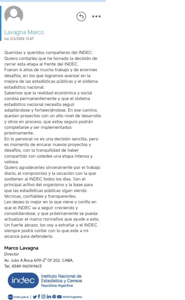 La Junta Interna de ATE INDEC expresó su profunda preocupación y elevó sospechas por la renuncia de Marco Lavagna en un momento especialmente sensible para el organismo. “Nos llama poderosamente la atención, nos pone en alerta”, señalaron, al advertir que la salida del director se produce a tan solo ocho días de la difusión del Índice de Precios al Consumidor.