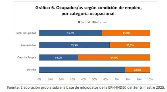 Al respecto, el discurso oficial sostiene que la elevada informalidad es consecuencia de un marco laboral “rígido” que desalienta la contratación formal. Sin embargo, el último informe de la Secretaría de Trabajo reconoce que después de dos años de gestión libertaria y de los cambios laborales ya implementados con la desregulación del mercado que sostuvo la “Ley Bases” aprobada en 2024, el 43,3% de los ocupados es informal, una proporción que supera en más de 5 puntos porcentuales la que correspondería al nivel de PBI per cápita de nuestro país, según la tendencia internacional.