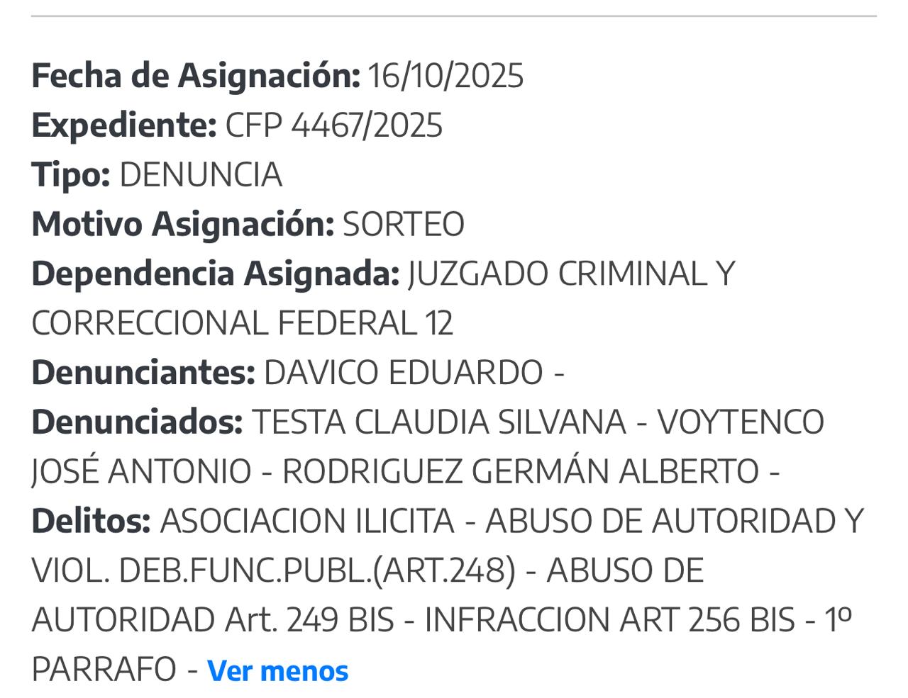 Vale remarcar que en la denuncia de Davico, ya ratificada, también se señala a Testa por la posible comisión del delito de Abuso de Autoridad y Violación de Deberes de Funcionario Público.