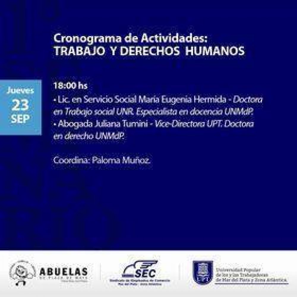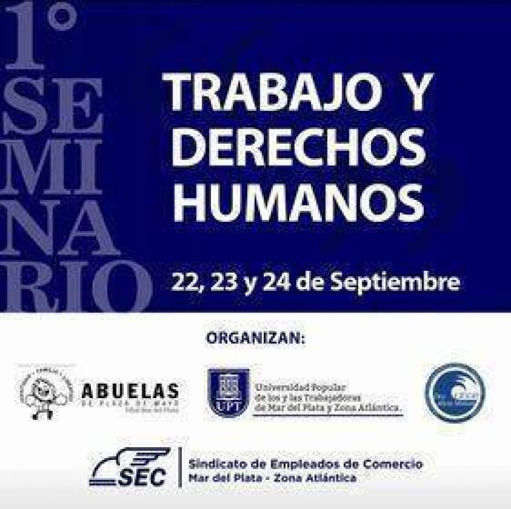 A partir del próximo miércoles 22 de septiembre se realizará la primera edición del Seminario de “Trabajo y Derechos Humanos”, organizado en forma conjunta por el Sindicato Empleados de Comercio Mar del Plata y Zona Atlántica, la Universidad Popular de los/as trabajadores/as (UPT), la Asociación de Abuelas de Plaza de Mayo filial Mar del Plata, y el Centro de Investigación y Docencia en Derechos Humanos Dra. Alicia Moreau (Facultad de Derecho/CIC).