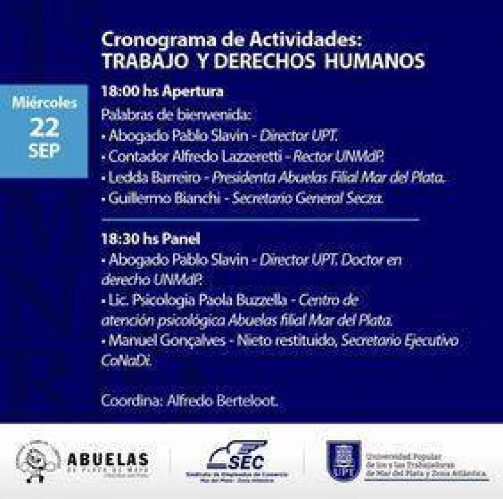 El Seminario se realizará en tres jornadas, los días miércoles 22, jueves 23 y viernes 24 de septiembre a partir de las 18 horas. El Acto de apertura, el día miércoles a las 18hs, contará con la presencia del director de la UPT Dr. Pablo Slavin, el rector de la UNMdP Cdor. Alfredo Lazzeretti, la presidenta de Abuelas de Plaza de Mayo filial Mar del Plata Ledda Barreiro y el secretario general del Secza Guillermo Bianchi.