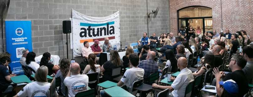 La mesa principal estuvo integrada por Merkis; el secretario gremial de FATUN, Rubén Núñez; y el secretario general de ATUNLa, Julián Di Silvestro. También participaron representantes de gremios nodocentes del Conurbano y referentes de distintas asociaciones de base.