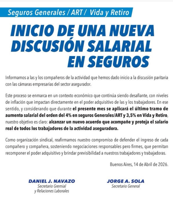 “Este proceso se enmarca en un contexto económico que continúa siendo desafiante, con niveles de inflación que impactan directamente en el poder adquisitivo de las y los trabajadores”, señalaron desde el Sindicato del Seguro y en este sentido, explicaron que “considerando que durante el presente mes se aplicará el último tramo de aumento salarial del orden del 4% en Seguros Generales/ART y 3,5% en Vida y Retiro, nuestro objetivo es claro: alcanzar un nuevo acuerdo que acompañe y proteja el salario real de todos los trabajadores de la actividad aseguradora”.