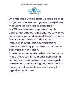 Finalmente, el comunicado de la CGT hizo hincapié en que «una reforma que flexibiliza y quita derechos no genera más empleo: genera trabajadores más vulnerables y salarios más bajos», y concluyó: «La CGT reafirma su compromiso con la defensa del empleo registrado, los convenios colectivos y las condiciones laborales dignas, al mismo tiempo que reclamamos políticas públicas que impulsen la producción, fortalezcan el mercado interno y promuevan un verdadero desarrollo con inclusión».