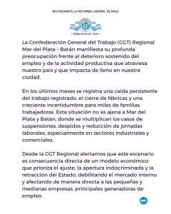A través de un comunicado, la CGT Regional Mar del Plata-Batán rechazó la Reforma Laboral impulsada por el gobierno nacional y manifestó su «profunda preocupación frente al deterioro sostenido del empleo y de la actividad productiva que atraviesa nuestro país y que impacta de lleno en nuestra ciudad».