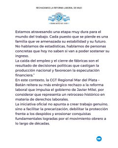 Por esa razón, la CGT Regional Mar del Plata – Batán insistió en expresar su «más enérgico rechazo a la reforma laboral que impulsa el gobierno de Javier Milei, por considerar que representa un retroceso histórico en materia de derechos laborales», además de puntualizar: «La iniciativa oficial no apunta a crear trabajo genuino, sino a facilitar la precarización, debilitar la protección frente a los despidos y erosionar conquistas fundamentales logradas por el movimiento obrero a lo largo de décadas».
