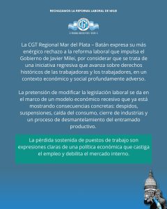 A través de un comunicado, La CGT Regional Mar del Plata-Batán expresó su «más enérgico rechazo a la reforma laboral que impulsa el Gobierno de Javier Milei, por considerar que se trata de una iniciativa regresiva que avanza sobre derechos históricos de las trabajadoras y los trabajadores, en un contexto económico y social profundamente adverso».
