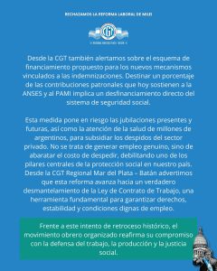 Finalmente, desde la CGT denunciaron que con este proyecto «no se trata de generar empleo genuino, sino de abaratar el costo de despedir, debilitando uno de los pilares centrales de la protección social en nuestro país», y aseguraron: «Desde la CGT Regional Mar del Plata – Batán advertimos que esta reforma avanza hacia un verdadero desmantelamiento de la Ley de Contrato de Trabajo, una herramienta fundamental para garantizar derechos, estabilidad y condiciones dignas de empleo». Por último, sentenciaron: «Frente a este intento de retroceso histórico, el movimiento obrero organizado reafirma su compromiso con la defensa del trabajo, la producción y la justicia social».