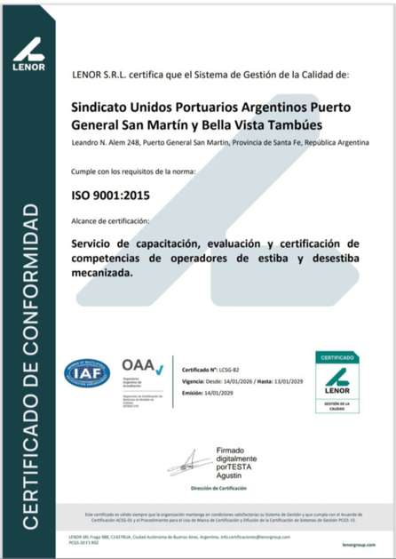 El Sindicato Unidos Portuarios Argentinos (SUPA) de Puerto General San Martín y Bella Vista Timbúes marcó un hito en la actividad gremial argentina al convertirse en la única organización sindical del país en obtener la certificación internacional ISO 9001:2015 para procesos de formación de estibadores.