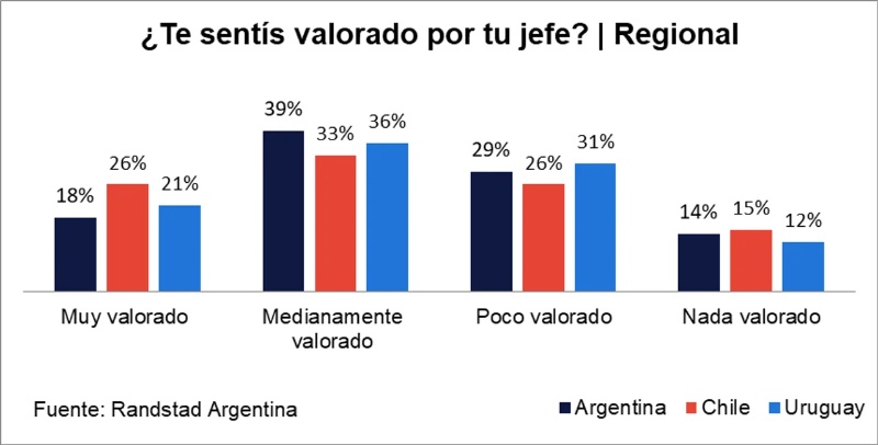 En el extremo opuesto, el 32% de los trabajadores argentinos y chilenos -y el 35% de los uruguayos- aseguran no haber recibido nunca un reconocimiento por parte de su superior.